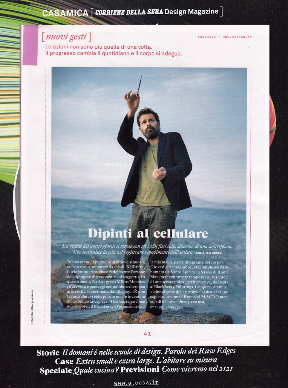 “Non ha niente a che vedere con il passatismo né con l’idea di avere inventato qualche cosa di nuovo: la tecnica che utilizzo per i miei Blackberry Paintings avrebbe potuto essere utilizzata già da molto tempo. Si tratta piuttosto di un utilizzo integrato di se stessi e di un computer. Lo smartphone è estensione del mio braccio, è parte di me. È come se filmassi con la mia stessa mano”, ci spiega Miltos Manetas. Che prosegue raccontandoci la genesi di questo suo nuovo metodo: “un paio d’anni fa sono precipitato sul Monte Conero, vicino ad Ancona, e mi sono salvato per miracolo. Una caduta rovinosa che mi ha costretto a lungo in ospedale, a Loreto. Una volta uscito, sono tornato sul posto dell’incidente e ho affittato una casa per un mese. Mi sono fatto portare colori e pennelli ma non riuscivo a lavorare. Finché un giorno ho cominciato a dipingere direttamente sul paesaggio, sulla natura, muovendo le mani nell’aria. L’incidente aveva cambiato la mia visione di essere umano contemporaneo, interrompendo la fiducia nel processo di scannerizzazione digitale della realtà. Ho rielaborato questo fattore al punto da inglobarlo nel mio fisico, nelle mie stesse mani”.