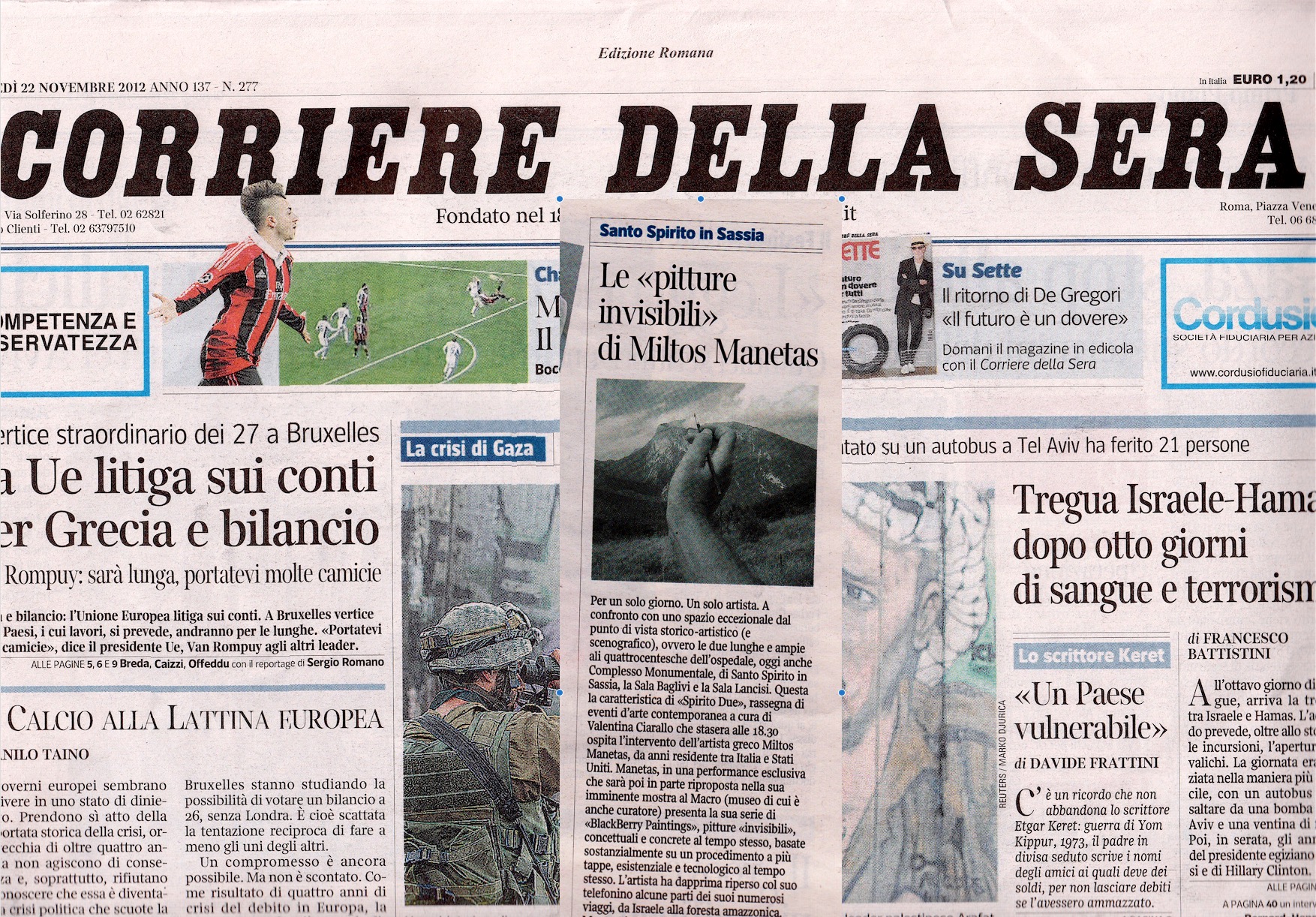 Sono due gli appuntamenti a Roma con l’artista greco Miltos Manetas, definito lo psicologo “post-contemporaneo”: il primo, il 22 novembre 2012 alle ore 19:00 al Complesso Monumentale di Santo Spirito in Sassia, (Borgo S. Spirito, 2) nel corso del quale Manetas eseguirà una performance per il progetto SPIRITO DUE, a cura di Valentina Ciarallo. Il secondo, mercoledì 28 novembre 2012 alle ore 19:00 al MACRO, dove Manetas presenterà il progetto speciale After BlackBerry Paintings. (In esposizione al MACRO di Via Nizza dal 29 novembre 2012 al 30 dicembre 2013).
